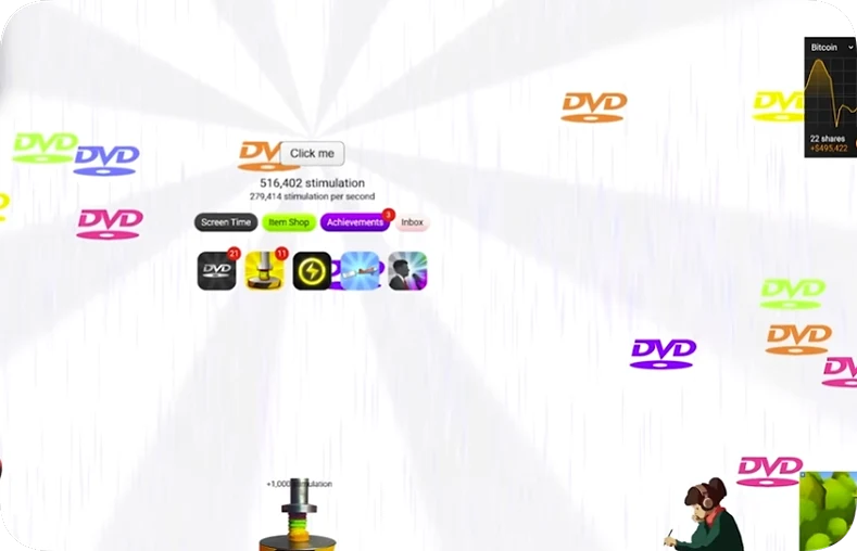 Stimulation Clicker unblocked is available to play for free online. Stimulation Clicker is a satirical idle clicker game created by Neal Agarwal that brilliantly comments on our constant need for digital stimulation. Click to earn stimulation points and purchase increasingly chaotic upgrades that generate more points automatically. The game features humorous upgrades like Social Media Notifications, True Crime Podcasts, and Bouncing DVD Logos. As you progress, your screen becomes overwhelmingly filled with visual and audio stimuli - a clever satire on modern digital life. Released in January 2025, this viral sensation perfectly captures the experience of being terminally online. Can you reach the end and unlock all upgrades while managing the chaos?